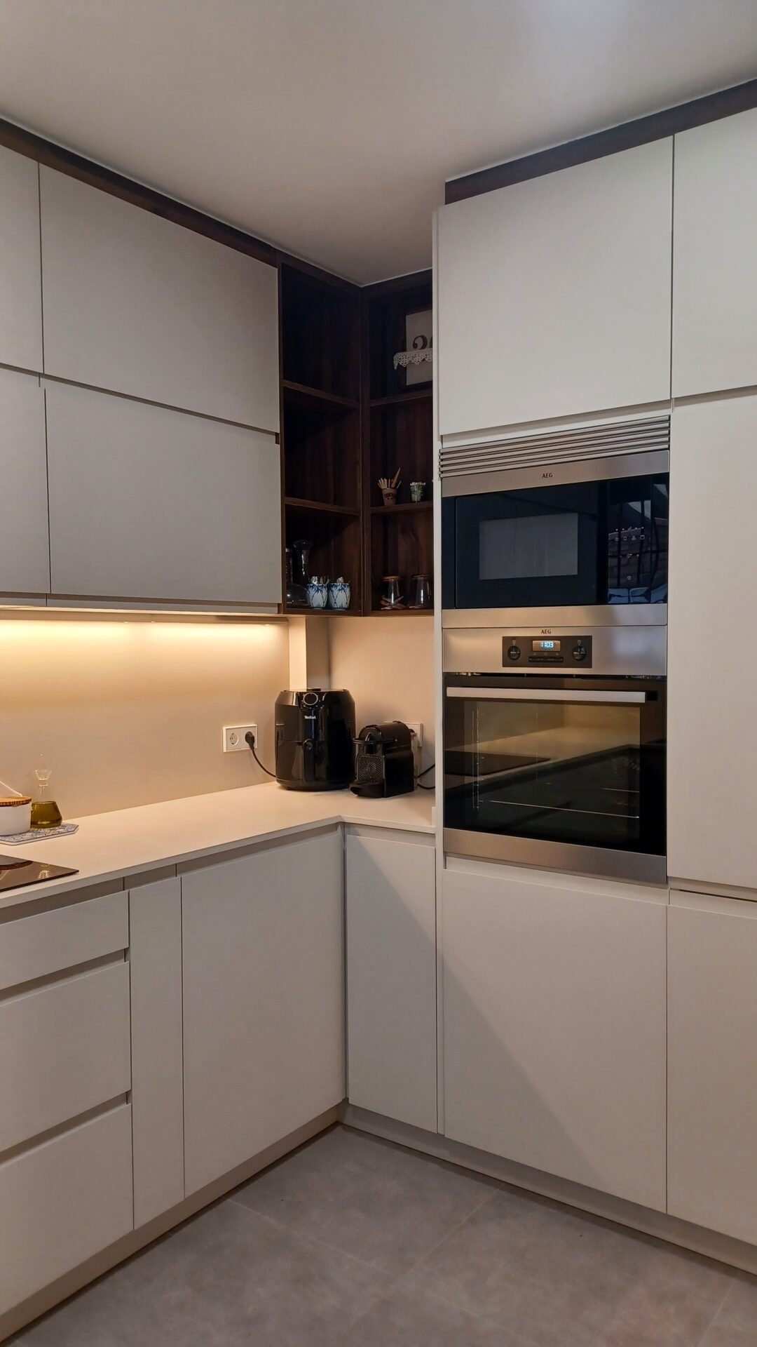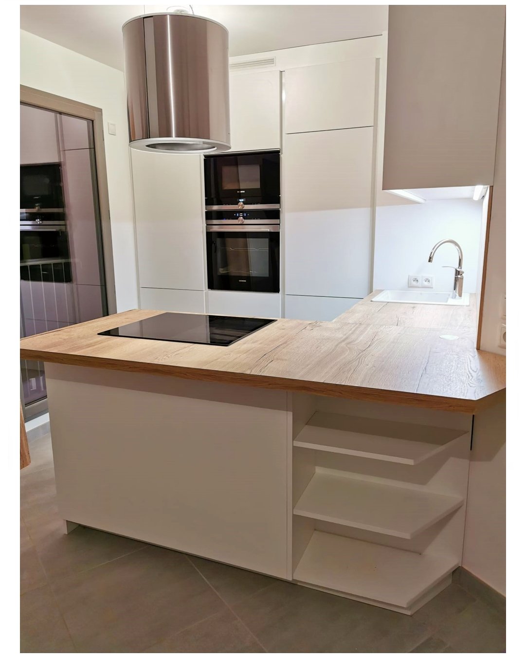 En este proyecto, diseñamos y montamos una cocina moderna con península, combinando el blanco con madera.