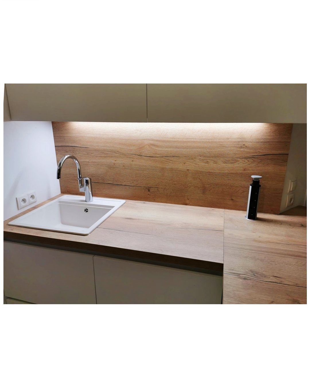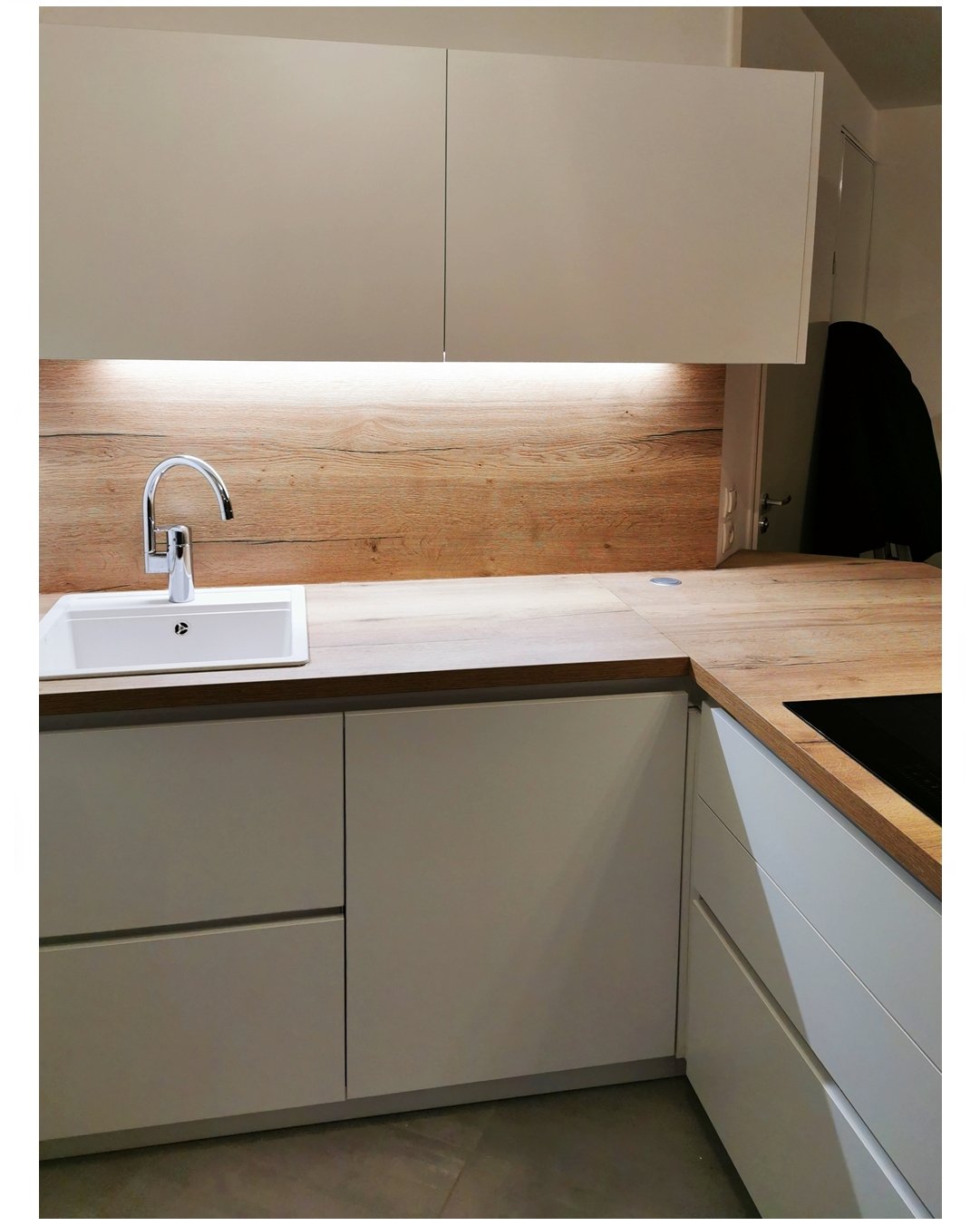 Muebles Laca Blanca Mate y Encimera/Frontales en Madera Egger.