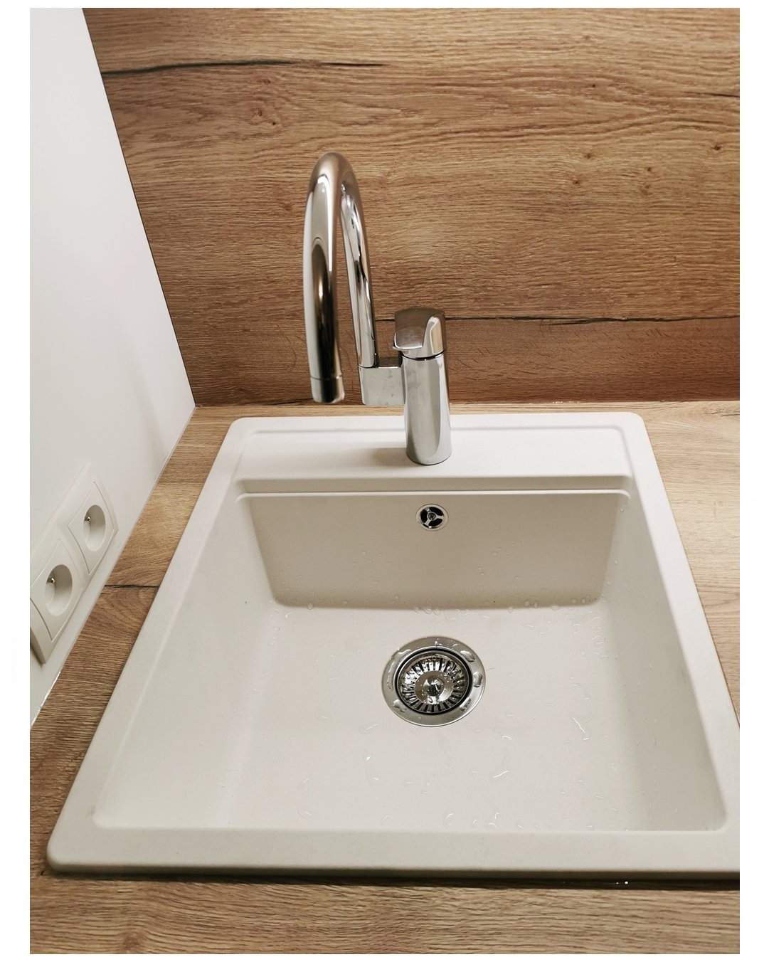 La encimera y el frontal son de madera de la marca Egger, que añade contraste y calidez al ambiente.