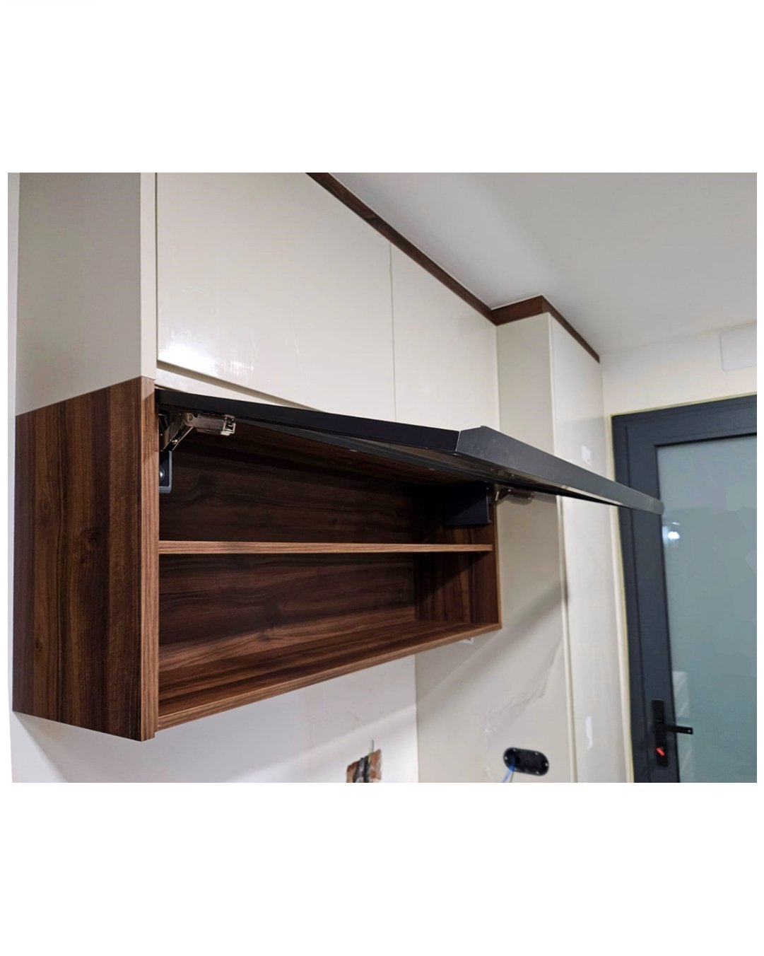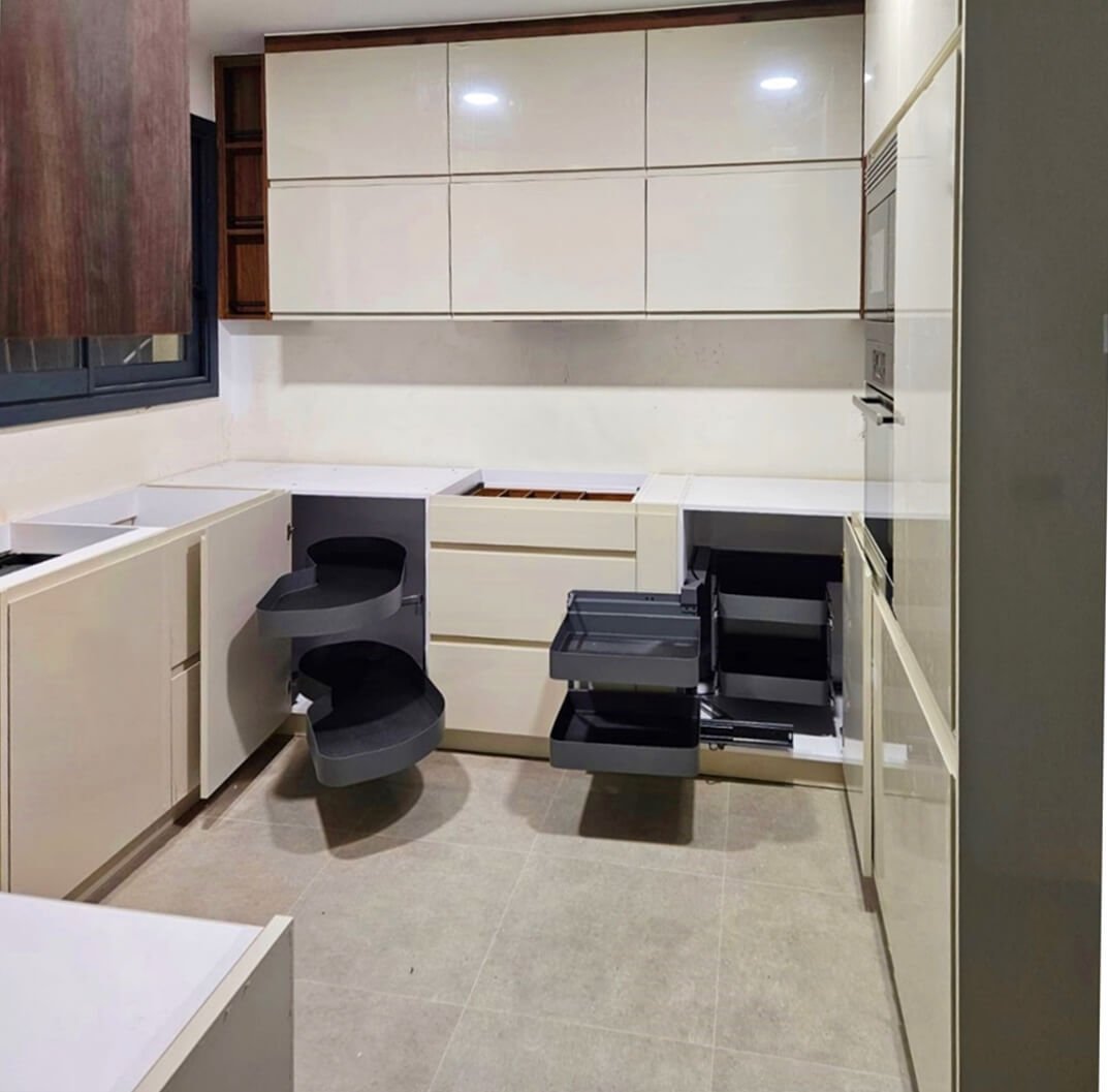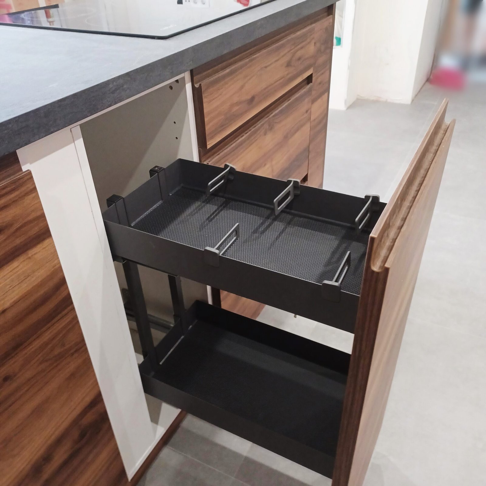 El diseño incluye varios accesorios de almacenamiento extraíble que optimizan el espacio y facilitan la organización, creando una cocina funcional y estética.
