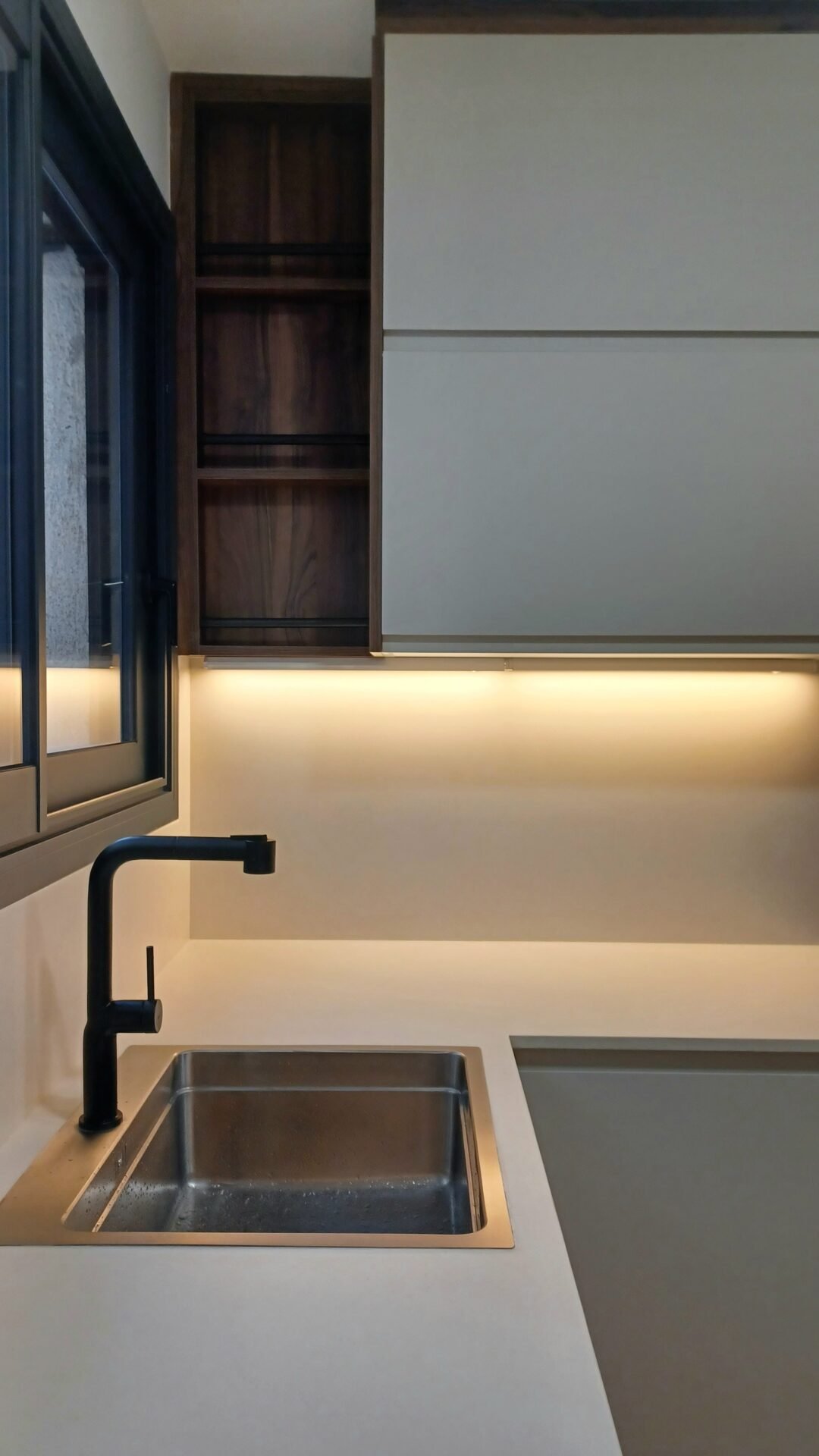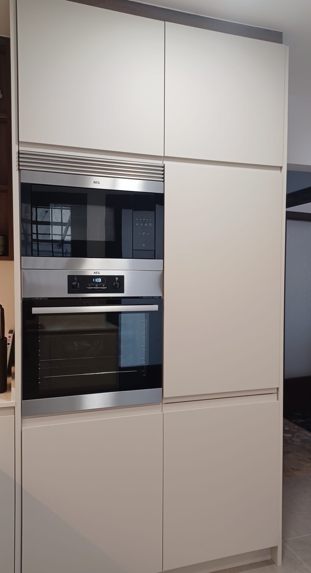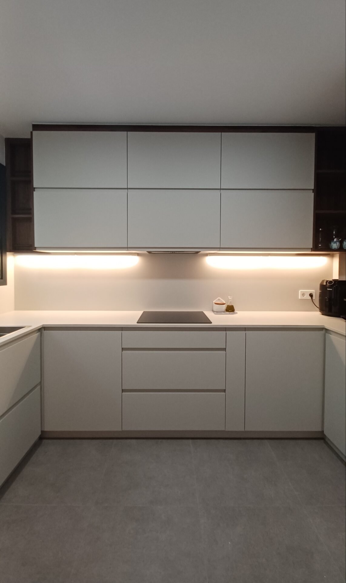 Esta cocina ha sido renovada por completo con muebles de tirador “J” integrado en color tendencia Taupe extra-mate, que garantiza un diseño elegante y de muy fácil mantenimiento.