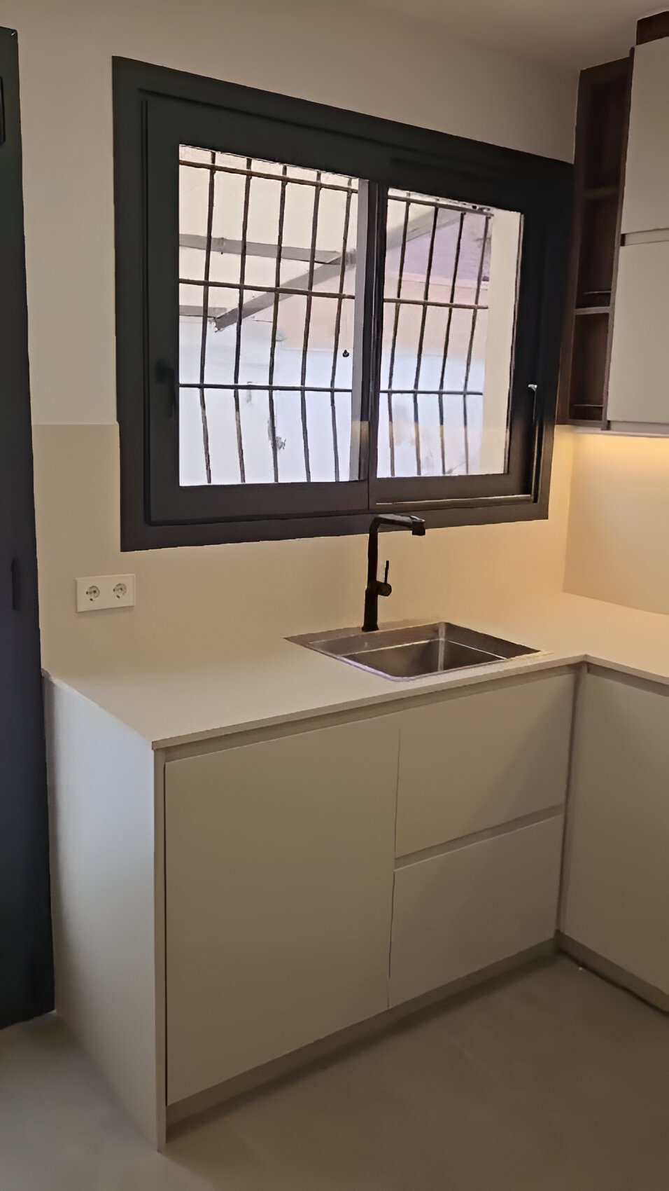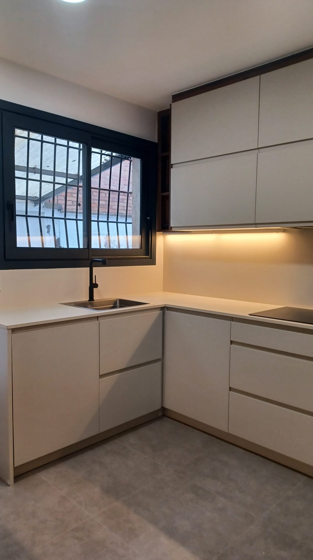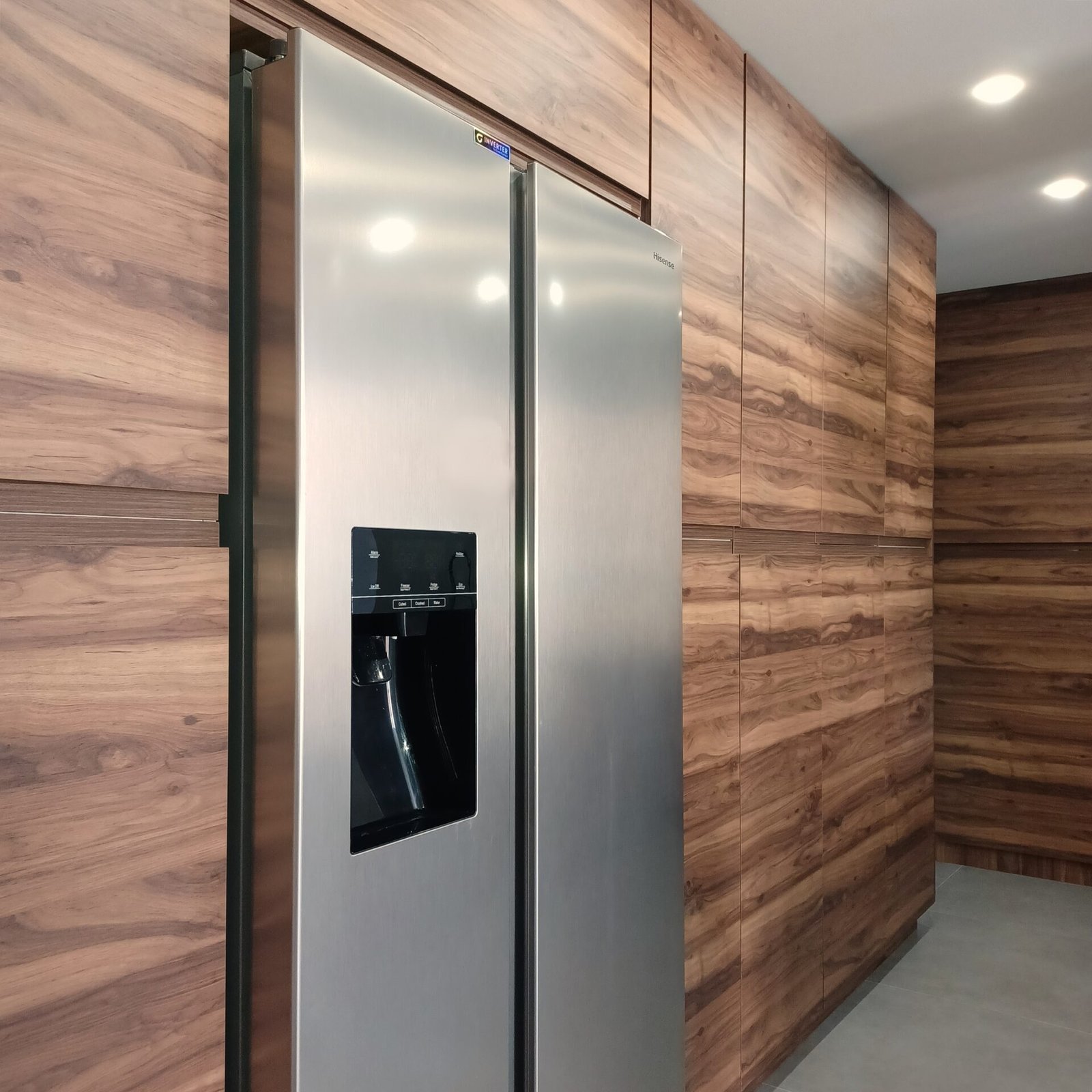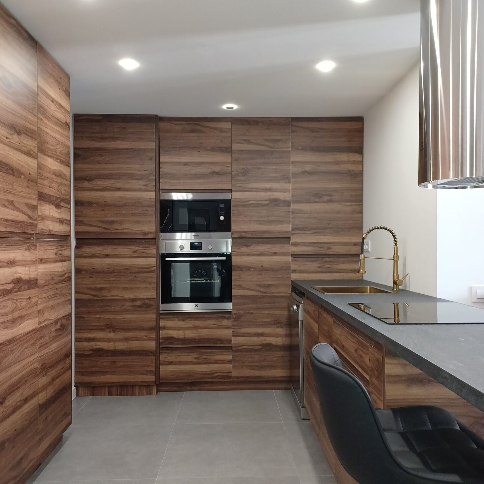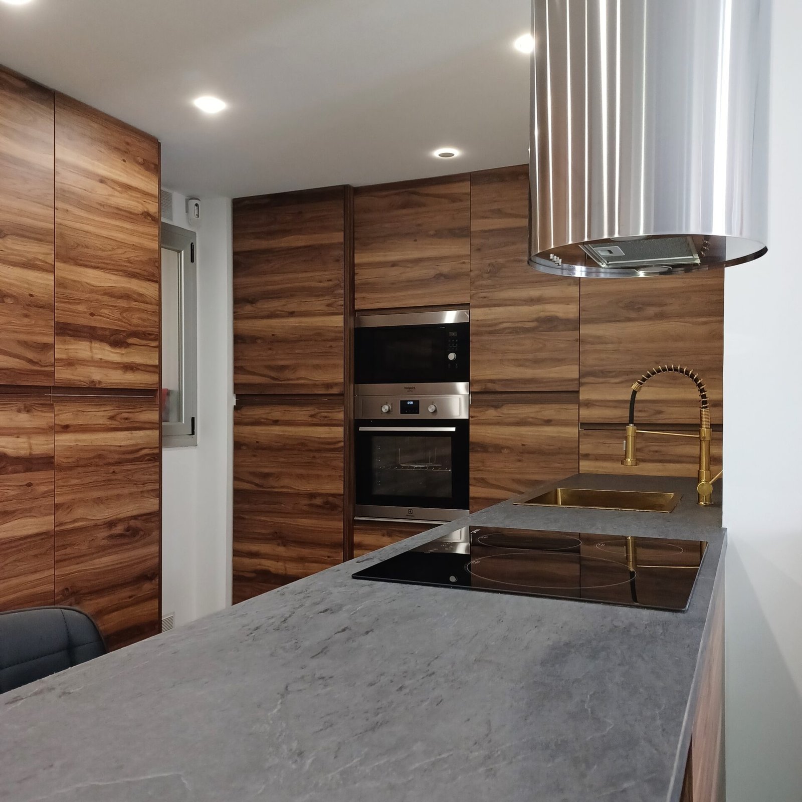 Para esta cocina reformada a medida en Mataró (Barcelona), la cliente eligió puertas y cajones, con tirador uñero en «J» integrado y fabricados con chapa de nogal.