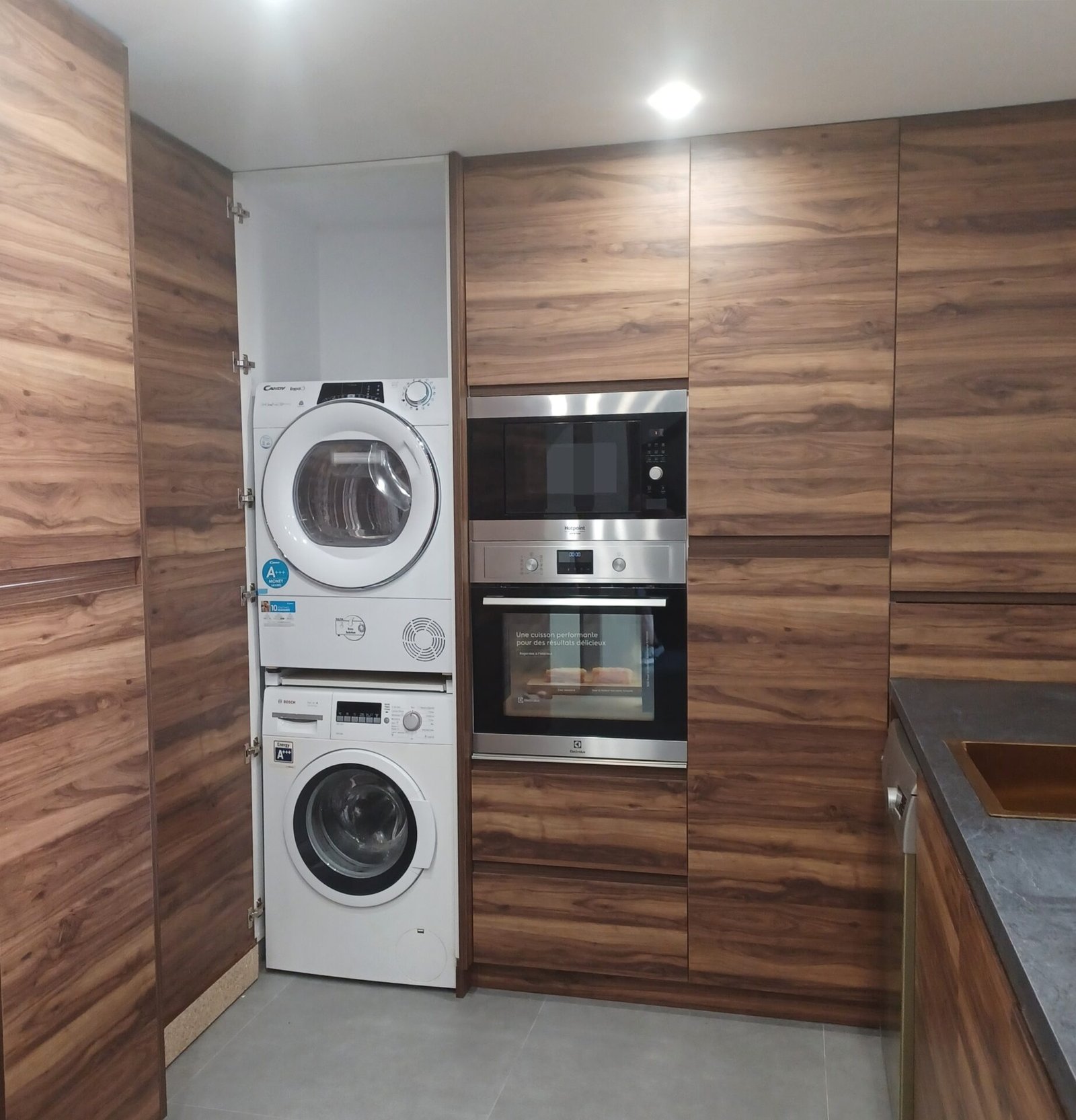 Se ha integrado una zona de lavado (lavadora y secadora), mueble desayunero y varios elementos de almacenaje para productos de limpieza, alimentos, etc.