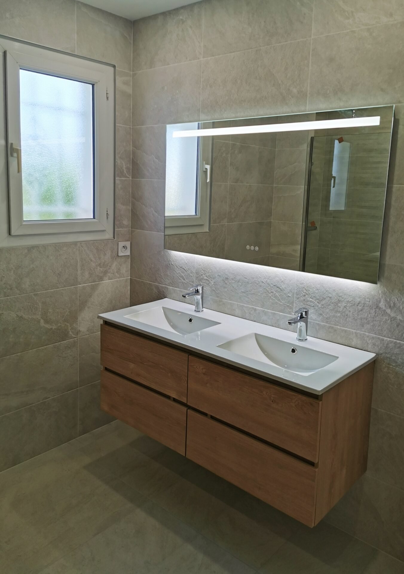El doble lavabo sobre mueble de madera optimiza el espacio y añade un toque cálido.