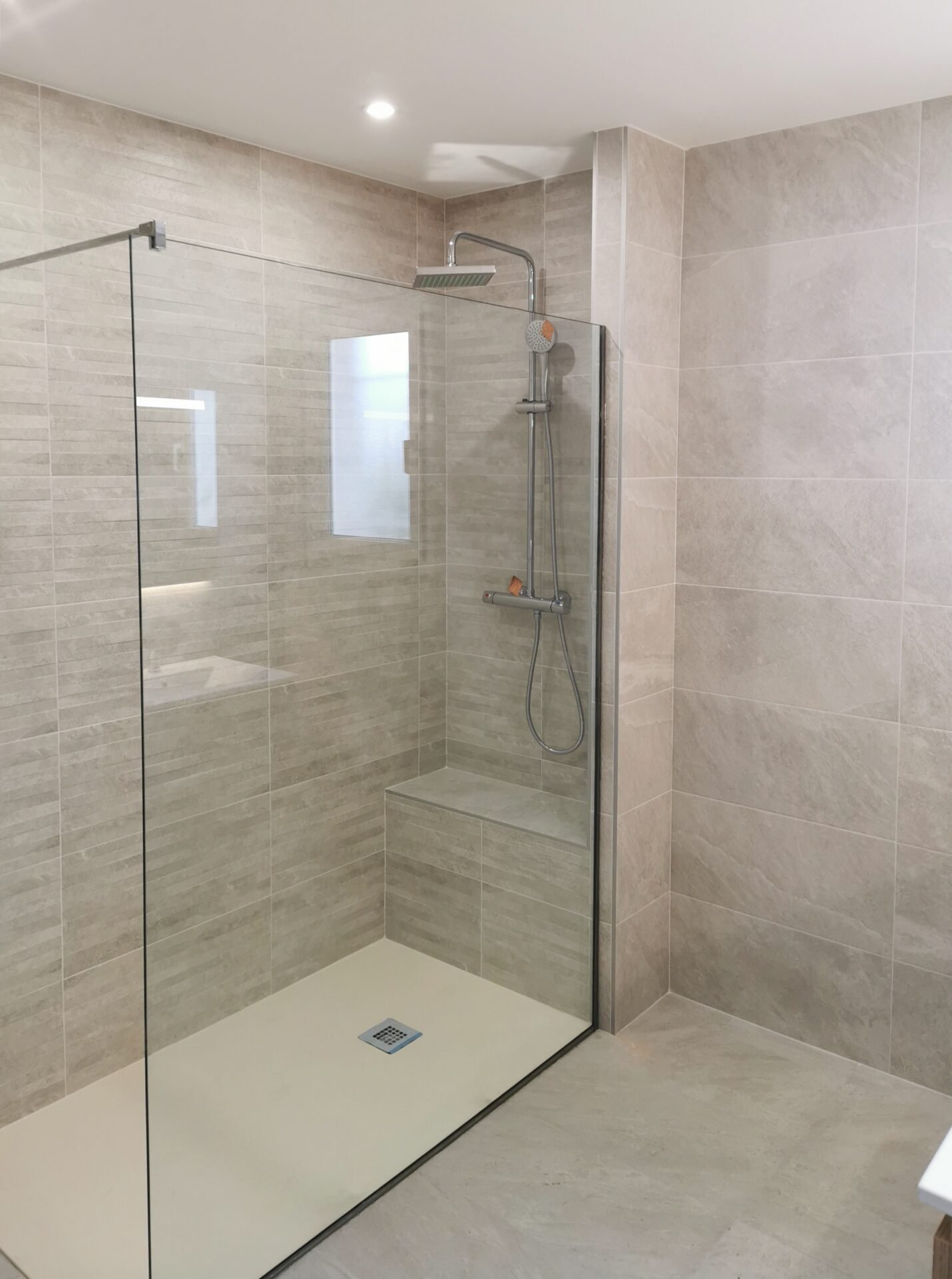 Destaca su ducha a ras de suelo con mampara de cristal y grifería efecto lluvia, aportando amplitud y confort.